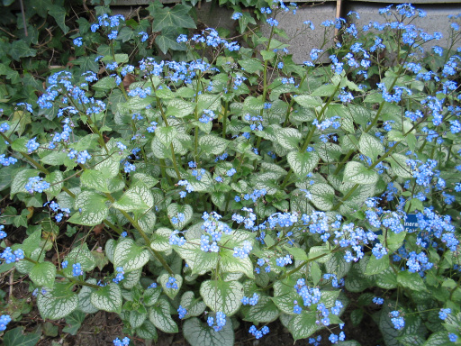 De bloeiperiode met lichtblauwe, vergeet-mij-nietachtige bloemetjes valt in de periode april-mei. De hoogte van Brunnera macrophylla bedraagt circa 30 tot 40 cm. Brunnera macrophylla kan ook in de zon maar dan dient de bodem voldoende vocht te bevatten bijvoorbeeld een zonnige standplaats op een vochtige veengrond. Een tweetal foto's zijn gemaakt in de november waarbij we Brunnera macrophylla tot onze verrassing bloeiend aantreffen!