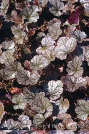 Heuchera 'silver scrolls' is een attractieve wintergroene vaste plant met een compacte en bossige, polvormende habitus en bijzonder attractieve, donkergeaderde zilvergroene, gemarmerde, gelobde hartvormige bladeren die in de lente eerst zilverrood verschijnen. Heuchera 'silver scrolls' bloeit van juni tot juli met rijkelijk veel opvallende witte klokvormige bloempjes. Deze plant houdt van een neutrale goed doorlaatbare grondsoort en houdt van een standplaats in gefilterd zonlicht of halfschaduw. Hij is goed winterhard, droogteresistent, ziekte resistent en heeft weinig last van ongedierte. Hij wordt bij ons vaak toegepast als bodembedekker in de border, de rotstuin, de schaduwtuin en als massabeplanting.
