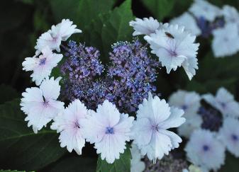 Hydrangea macrophylla 'Koria' is een middelgrote hortensia met prachtige vlakschermige bloemen, met opvallend gekartelde steriele witte randbloemen en roze tot blauwe fertiele binnenbloempjes, de uitbloei is groen met een roze schijn.