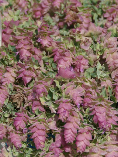 Origanum rotundifolium 'Kent Beauty' bloeit met zeer opvallende bloeiwijzes. Uit de groene hopvormige bloemen komen kleine roze bloempjes. Later kleuren de chutbladen ook naar roze. De plant velangt een droge standplaats.